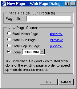 At the new page dialog give your new page a title, and select the source. It can be based it on a blank homepage, blank sub page or even clone one of the pages you have already created, thus an existing page can be reused, such as navigation links or common titles to save time.