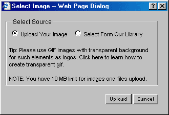 Check the "Select Form Our Library" box and click the "Select" button. The Site2You Graphical library window will appear. In the left pane please choose the category and subcategory of the images you'd like to add. You will see the thumbnails of the images in the category at the right pane. Click on the image to see its actual size and than click "Insert" button to insert image onto your page.