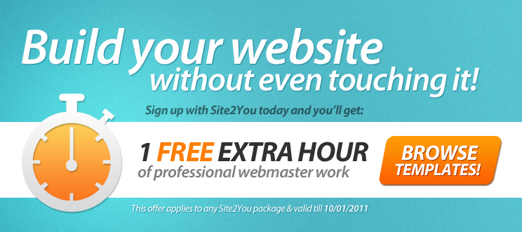 Duration: This offer starts on 06/01/2011and expires on 10/01/2011. Any trial account registered before 10/01/2011 still receives a bonus hour of webmaster time upon gaining Site2you Membership.