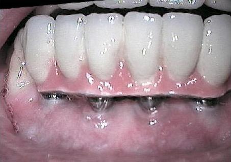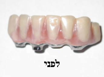 מתרפאה , גיל 45 פנה למרפאה עם תלונה ל"סריפה" באזור פלטה על שתלים עשויה מכרום-קובלט ואקריל. אחרי בדיקות התברר שהיא סובלת מאלרגיה לחומרים הניילים. יחד עם הרופה החלתנו לעשות גשר מוברג על שתלים מזהב עם ציפוי חרסינה וכבר 3 שנים היא מגיה רק לביקורת בלי שום תלונה