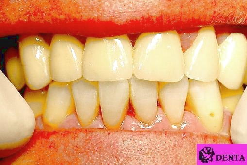 מתרפאה, גיל 50 עשוי גשר טוטלי בלסת עליונה עם מטרה אסטטית ( החלפה כתרים ישנים). מתכת וירון 99,חרסינה ויטה אומגה